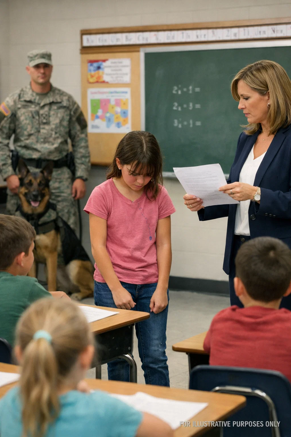 Then the principal, Dr. Margaret Wallace, arrived, summoned by the office staff who had seen Dad and the dog arrive. She stepped into the classroom expecting chaos and found the opposite: a silent, controlled Marine, a German Shepherd who could have been carved from stone, and a teacher whose authority had been quietly dismantled by evidence.