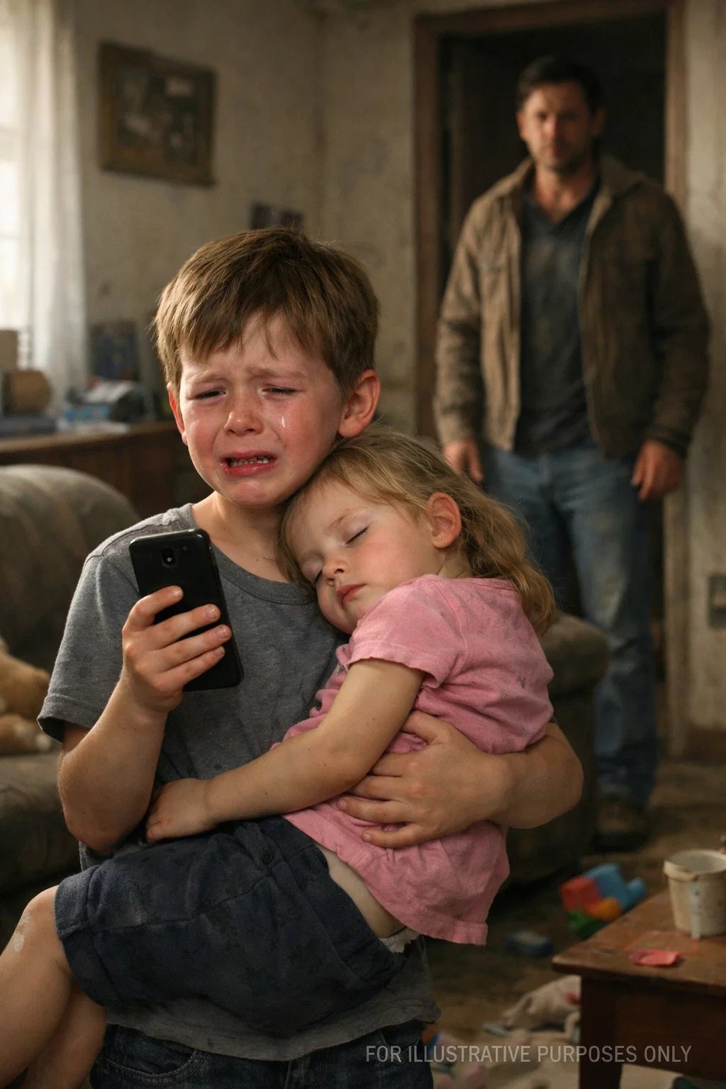 The boy sniffed, trying to steady himself in that quiet, determined way children do when they have already held themselves together for too long. “Dad… Lily won’t wake up right. She just keeps sleeping, and she feels really hot. Mom isn’t here. We don’t have anything left to eat.”