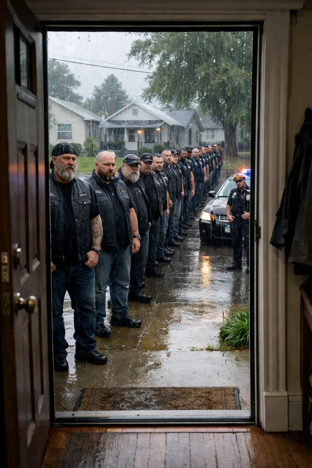 Two patrol cars rolled slowly down Linden Street, tires hissing against wet asphalt. Officers stepped out cautiously, scanning the line of bikers who stood shoulder to shoulder along the curb.