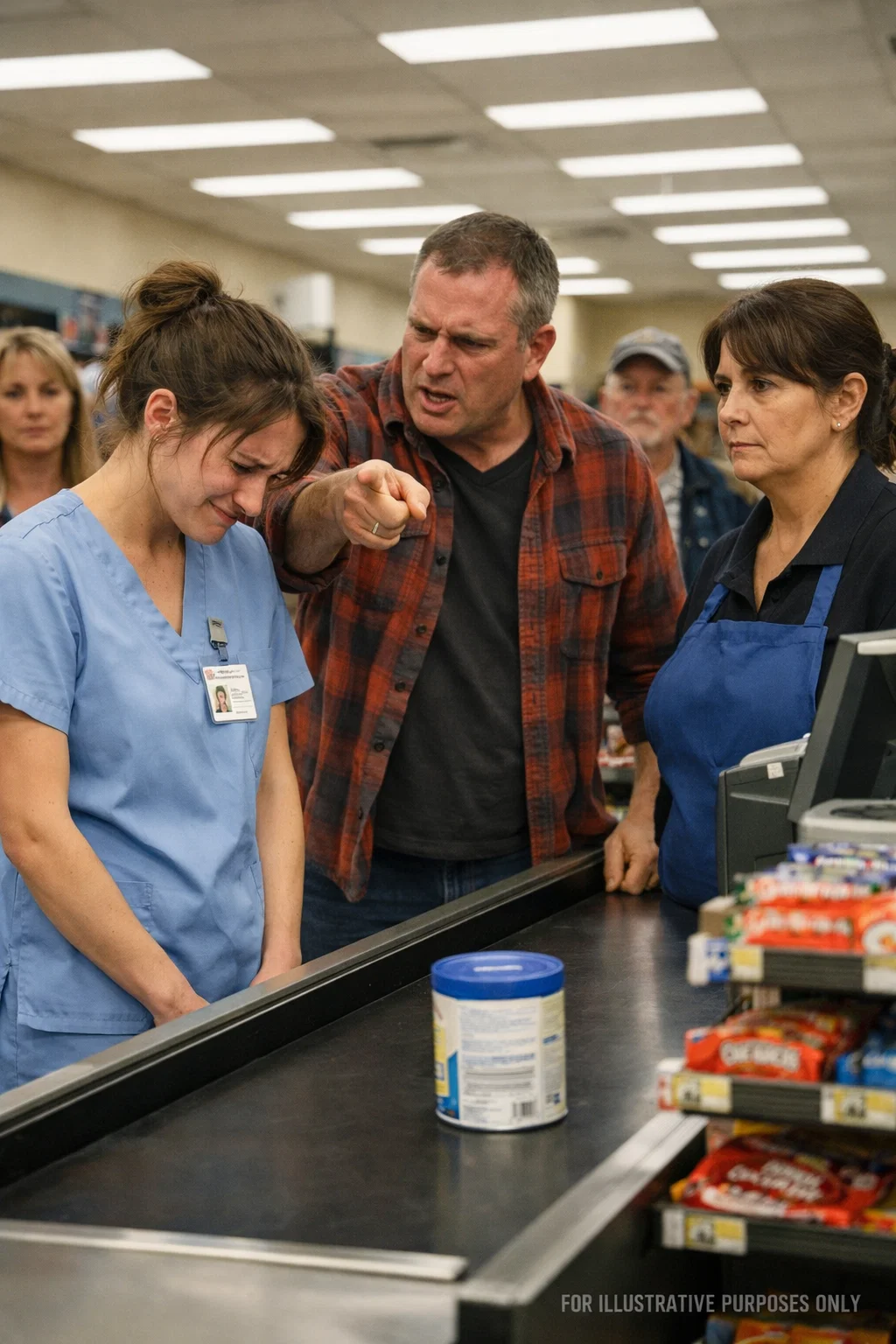 The checkout line was short. One man ahead of me, tossing motor oil and beef jerky onto the conveyor belt like he was in a hurry. And in front of him, a young woman in wrinkled blue scrubs, holding a single can of hypoallergenic baby formula.