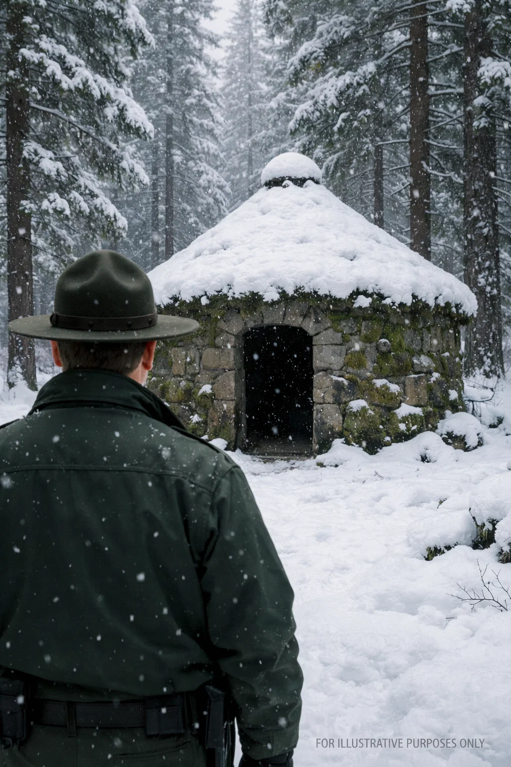 The old stone cabin sat in a shallow clearing under two massive hemlocks, its roof steep and dark with moss, its chimney rising solid and square as if time had failed to move it. The walls were built of mountain rock fitted by hand, each stone larger than it had any right to be. A narrow porch sagged along the front. One window was boarded. The other reflected nothing but cloud.
