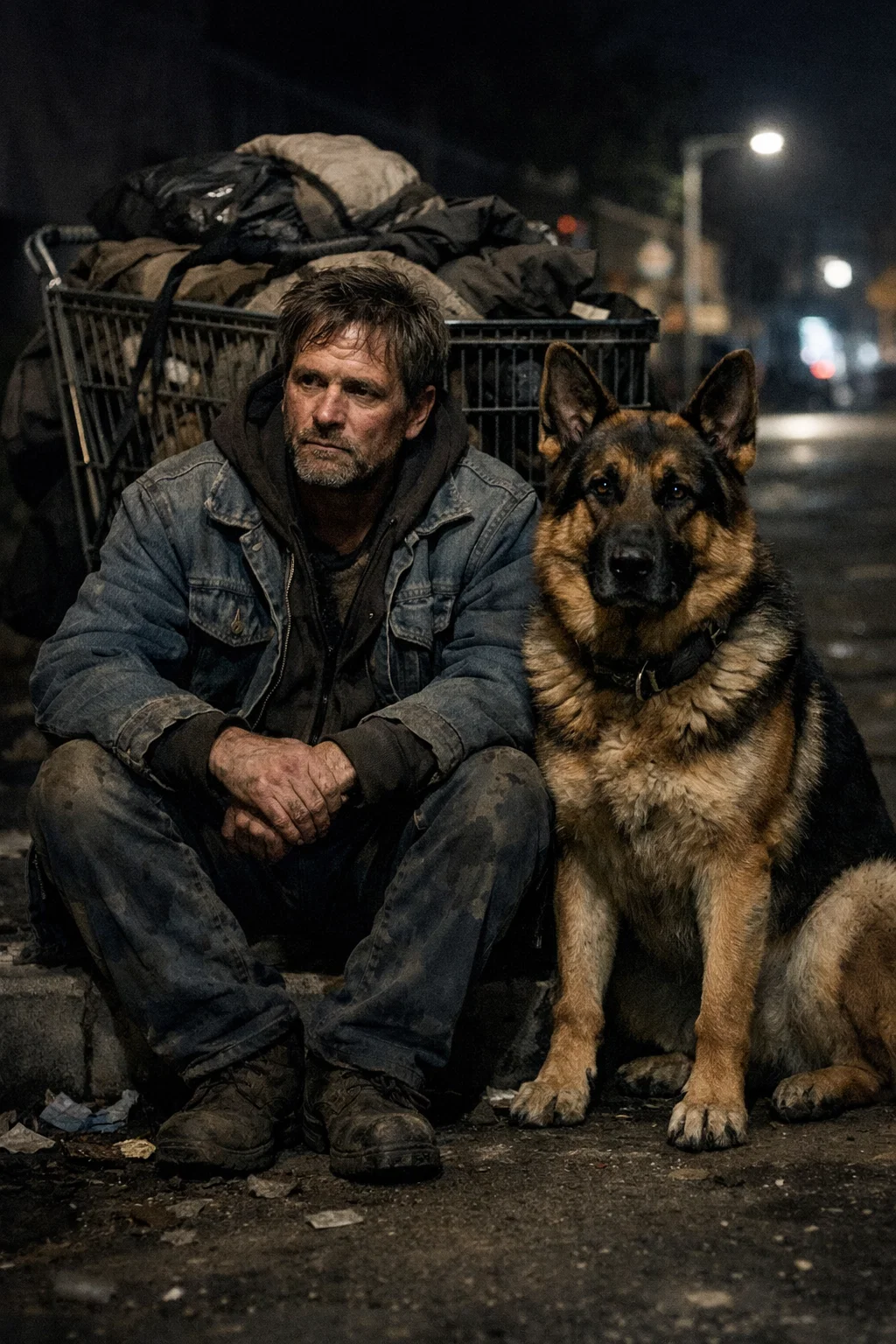 A man sat on the curb, knees pulled close, a large German shepherd curled protectively at his side. He looked like he was in his late forties, but it was the kind of late forties shaped more by hardship than years. His clothes were wom his hands trembling lightly in the cold. The dog, in contrast, looked strong- alert and loyal