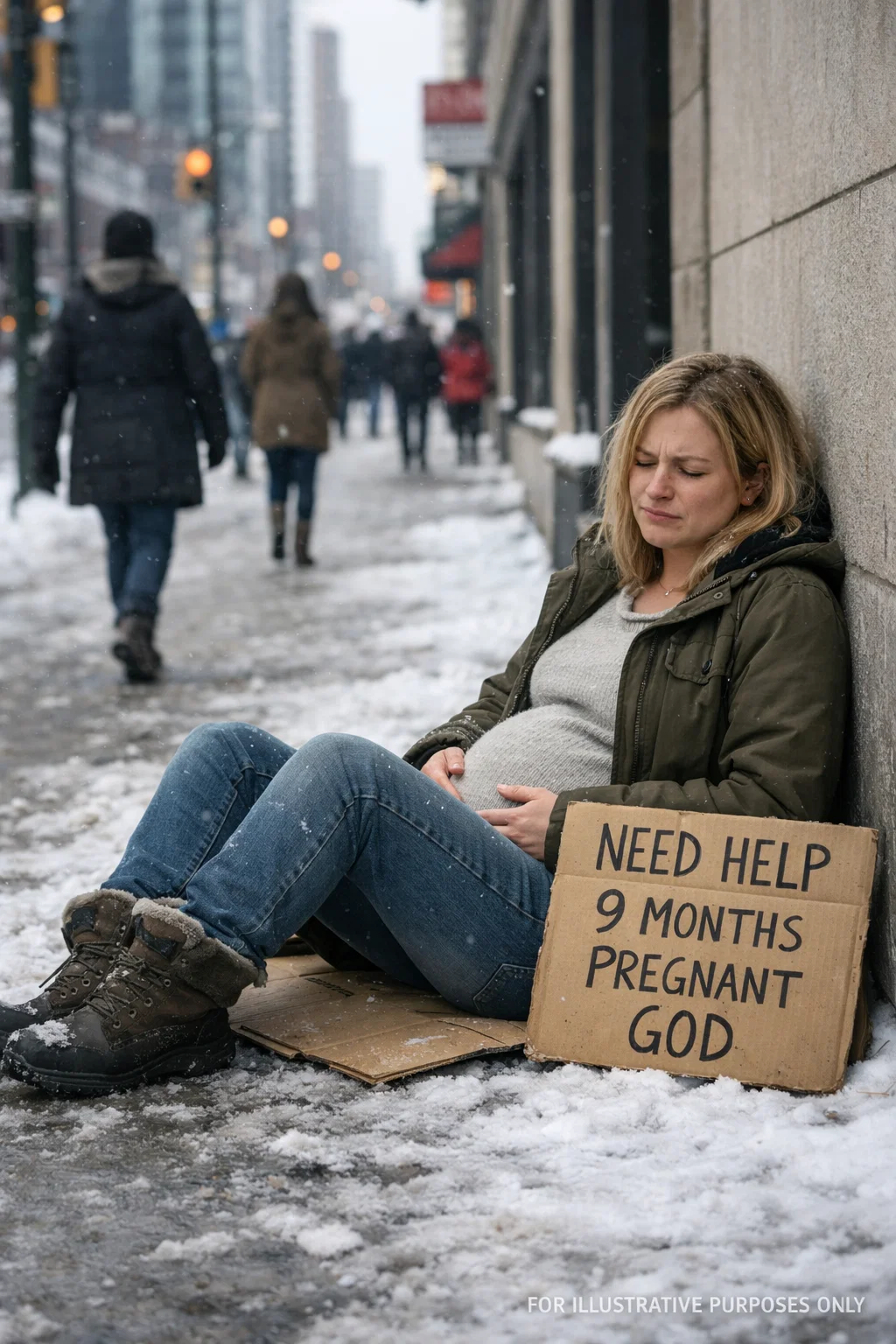She couldn’t have been more than 20, maybe 21, with this huge pregnant belly stretching her too-thin coat, one hand braced on the wall and the other clutched around her middle like she was holding herself together.