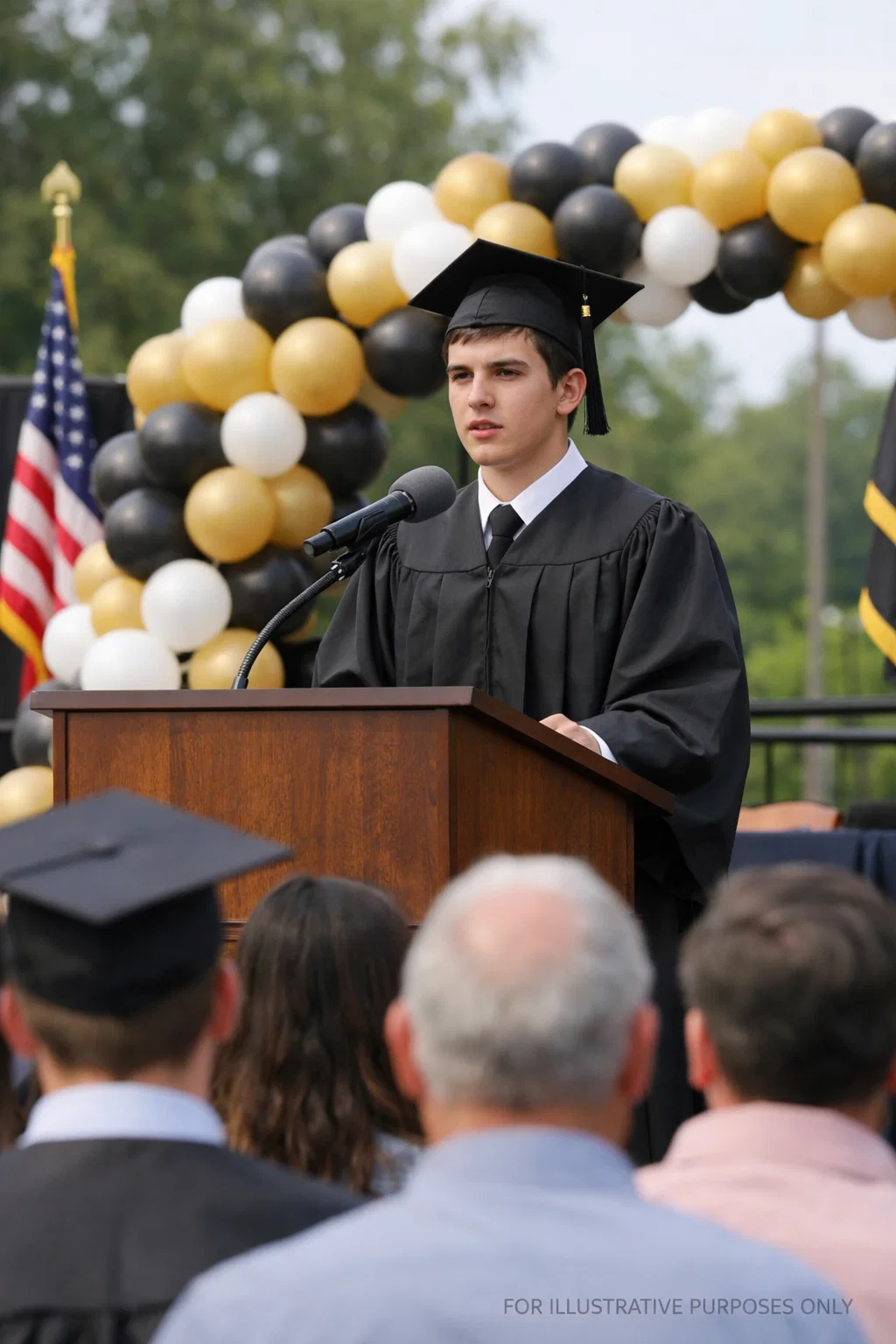 Into the microphone, he said, “I asked the school if I could use part of my speech for this. They said yes. I know my mom hates being put on the spot, and she is probably furious already, but I need to do this while standing in the place she paid to get me to.”