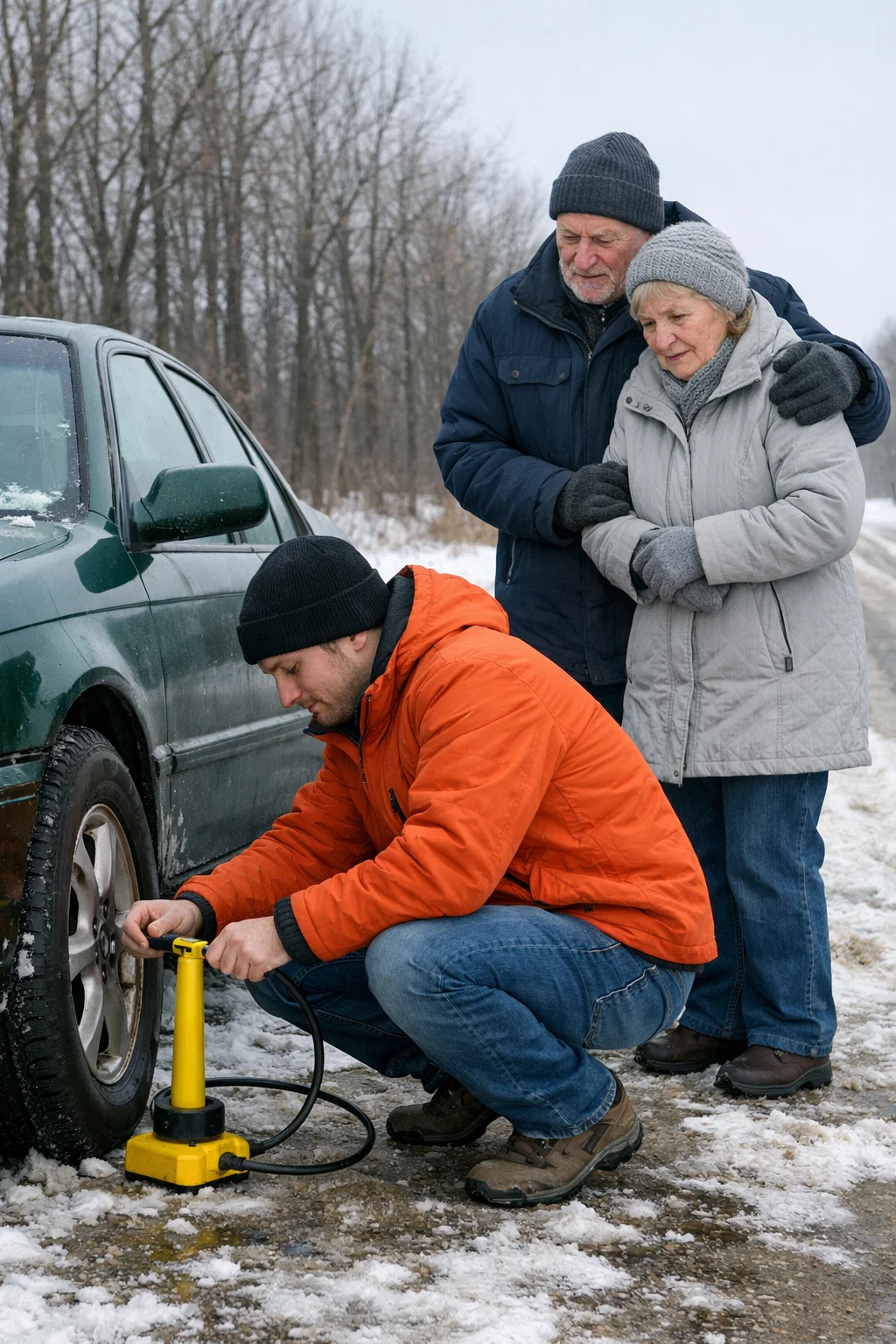 The car looked like it had survived too many winters. Beside it stood an elderly couple in thin coats, shivering in the wind. The man stared at a completely flat tire as if it had betrayed him personally. The woman hugged herself tightly, trembling against the cold.