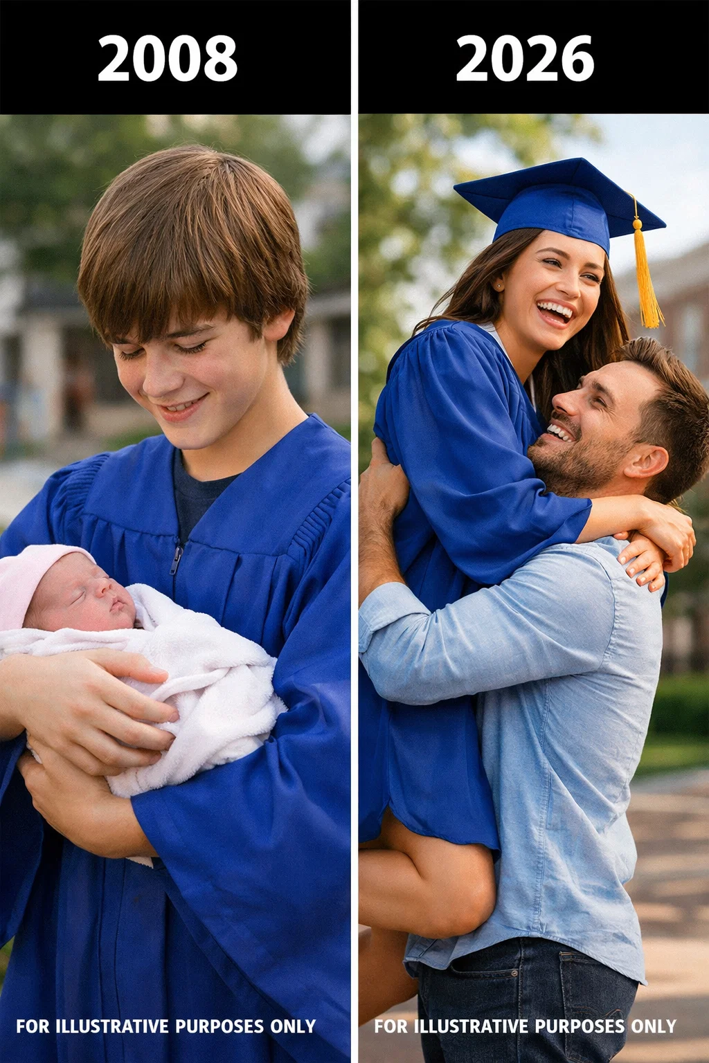 The picture shows a skinny teenage boy standing on a football field in a crooked graduation cap. He looks terrified. In his arms is a baby wrapped tightly in a blanket.