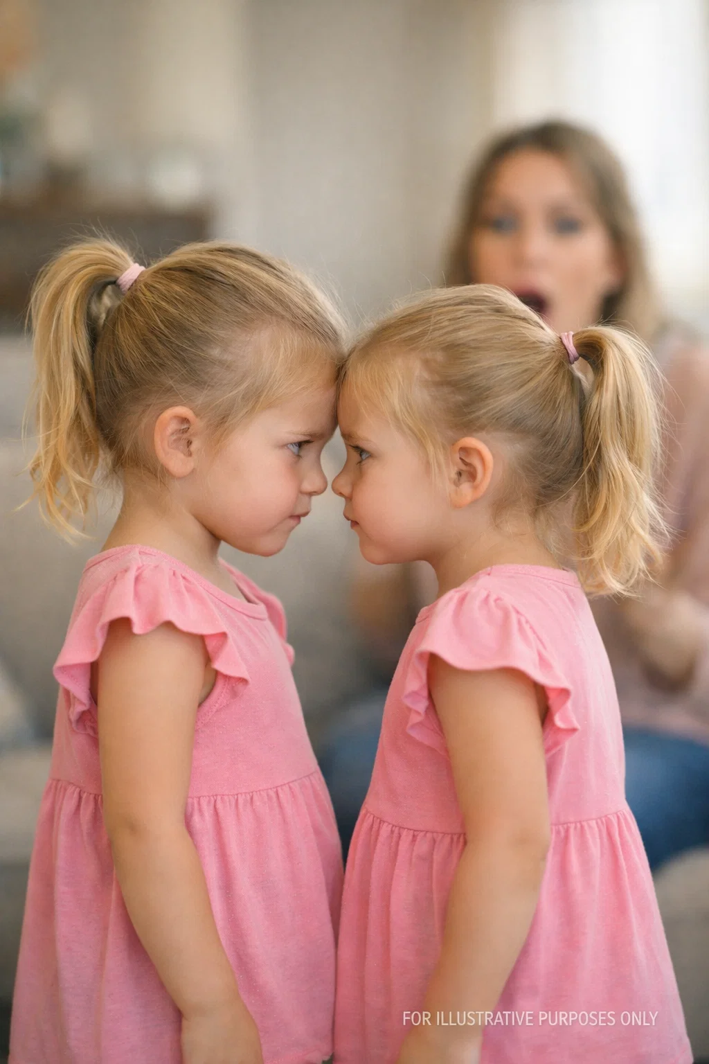 He was leaning over the kitchen counter answering emails on his phone, tie loose, face lit cold by the screen. “She’s four,” he said. “At four, every kid with brown eyes is a twin.”