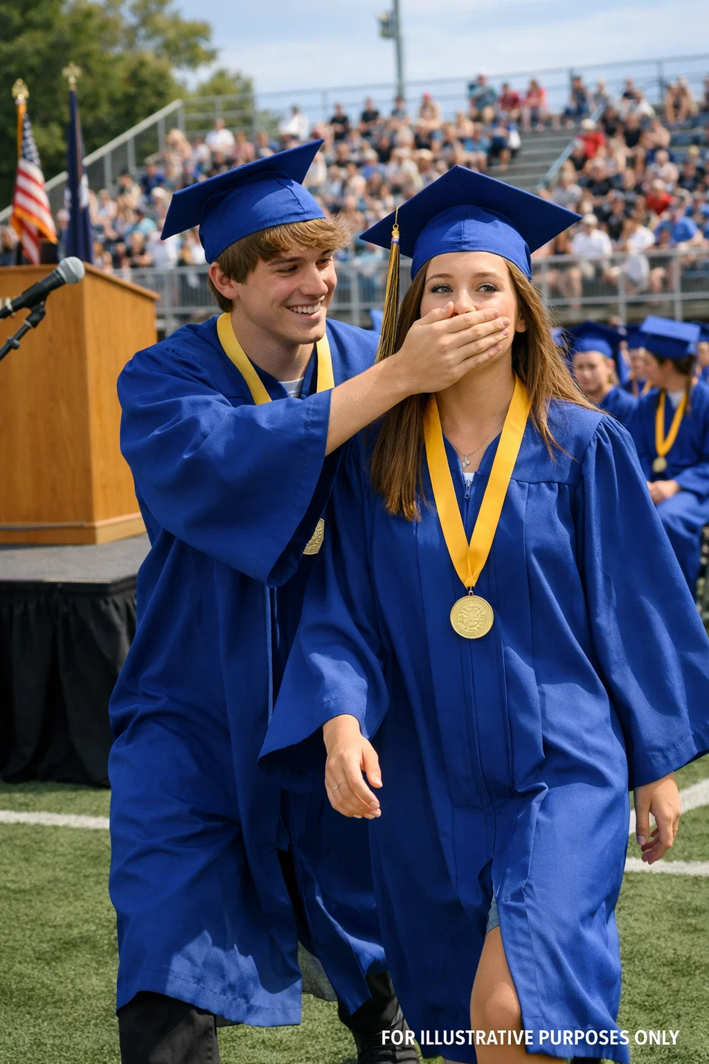 Near the edge of the stage stood Emily Carter, dressed in her graduation gown with the valedictorian medal resting against her chest. She looked composed, almost quiet, as if the moment belonged to everyone else more than to her.