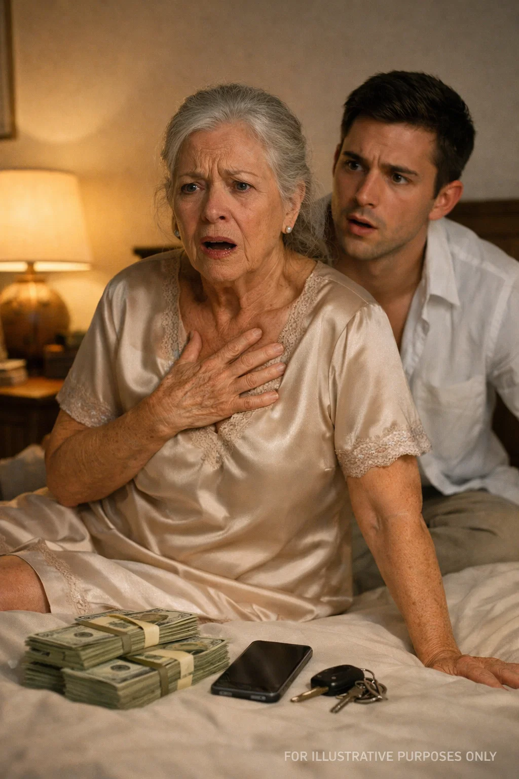 Later that night, when we were finally alone in a large room with high ceilings and dim lighting, Eleanor slowly closed the door with trembling hands and placed a thick envelope along with a set of car keys on the table next to us.