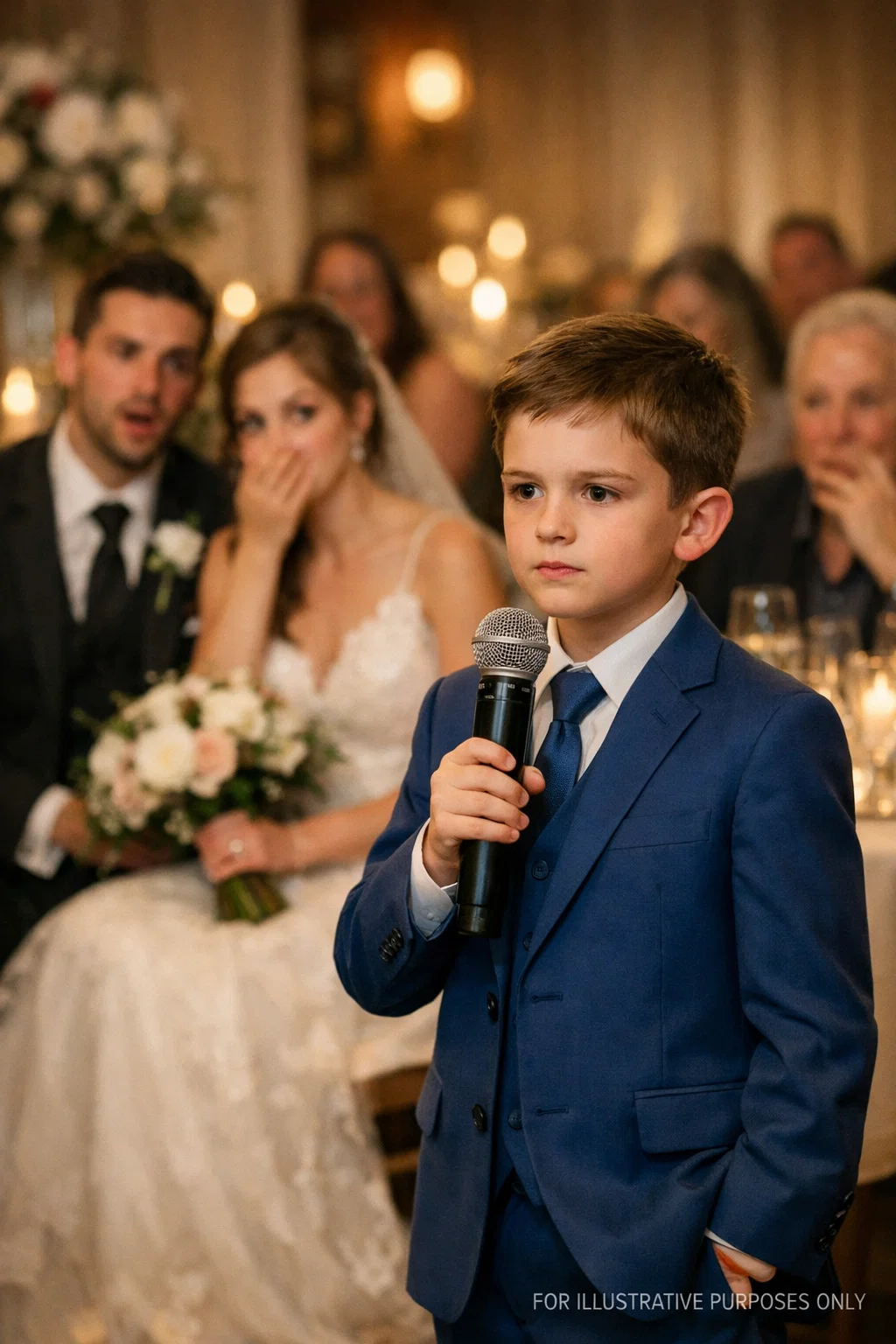 He was wearing a white shirt that had wrinkled during dinner and a little navy tie that had gone crooked hours earlier. He looked heartbreakingly small walking toward the stage, but he walked with purpose. People noticed him one by one. Chairs shifted. Conversation faltered. The DJ lowered his hand toward the microphone as if to stop him, then hesitated.