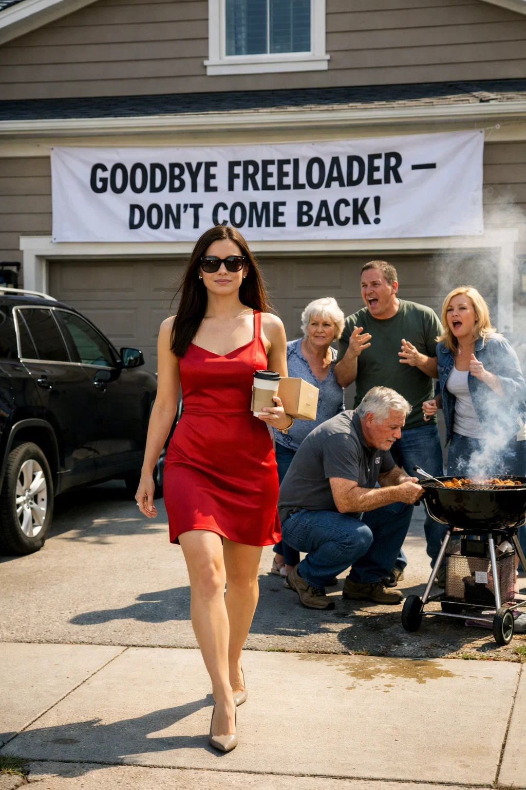 The day my father decided to celebrate throwing me out of his house, he did it with the theatricality of a stadium ribbon-cutting. I pulled into the gravel driveway of my childhood home, intending to retrieve my final banker’s box of files, and found a grotesque festival in progress. A massive vinyl banner, at least twelve feet long, was stretched across the garage door in aggressive, crimson block letters: GOODBYE, FREELOADER. DON’T COME BACK.