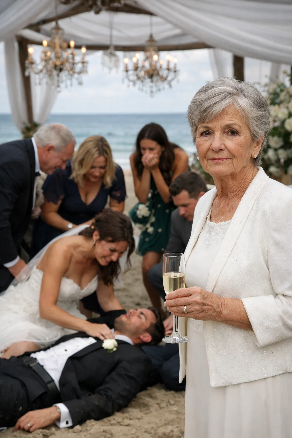 The police tackled Marcus into the sand. The white tuxedo was instantly ruined. Handcuffs clicked—a sound sharper than the champagne flutes.