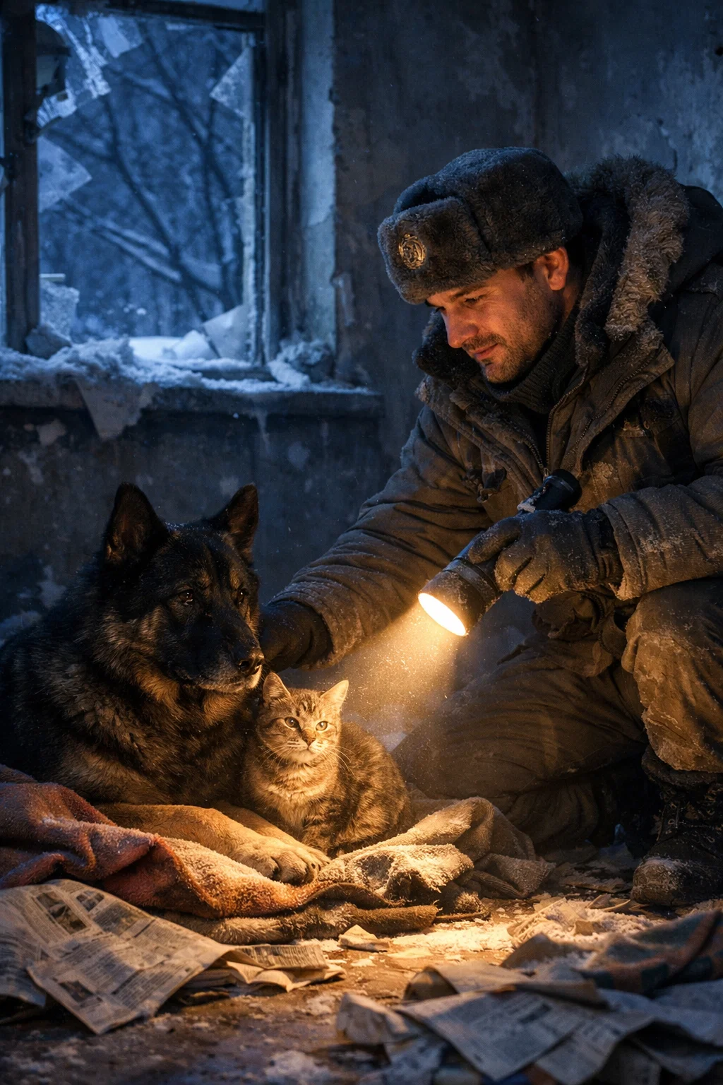 Beneath him lay a cat, barely more than bones wrapped in thin gray fur. One eye socket was sealed shut with old scar tissue; the other was clouded, unfocused. The cat’s body trembled faintly, the kind of tremor that meant it was losing the fight against the cold.